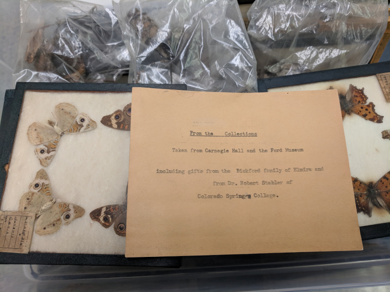| During June of 2010 this collection was found in cigar boxes at the back of a rarely used storage room in Kolker Hall on the Elmira College Campus, this collection appears to have been a part of the Ford Musuem collection.  The Ford Museum was a natural history collection at Elmira College started by Darius Ford in the mid to late 19th century. The presence of this moth collection at Elmira College is likely the work of Professor Elizabeth Leigh Whittacker. Elizabeth Leigh Whittaker was born on 21 September 1874, in Salford, Lancashire, England. She attended Cornell University and received a BA in Biology. In 1905 she joined the Elmira College Faculty. Shortly after her arrival Elmira's long time science professor, Darius Ford, retired. She was a professor at Elmira College for the next 39 years, retiring in 1942. She received an honorary doctorate Sc.D from the college in 1925. The British Government awarded her the King George Medal for her work in British War relief during World War II. She died on 6 April 1954, at the age of 79, and is buried at Trumansburg, New York. I suspect this moth collection was something she may have acquired while at the college. Many specimens within our teaching collection were prepared by Professor Whittacker and many of the slides our students use have her name in beautiful script at the bottom of the labels. All species names listed are those from the specimen labels and may not be accurate identifications or currently valid. This list is a historical record of several collections including an amateur lepidopterist's collection and should not be used for identification. For more information on the collection please contact Dr. Daniel Kjar at Elmira College. |